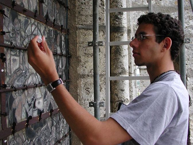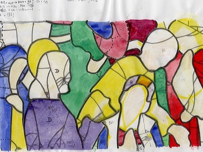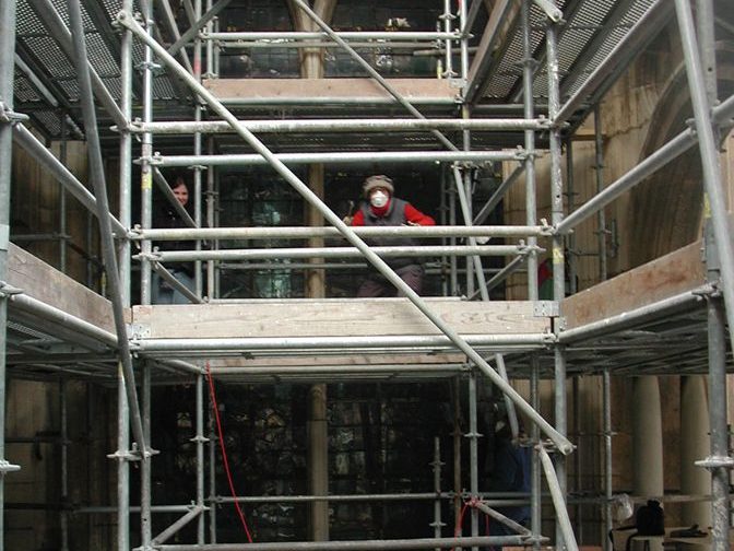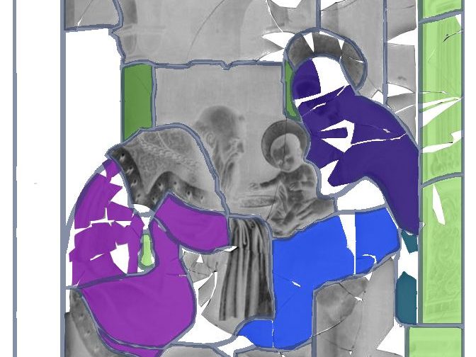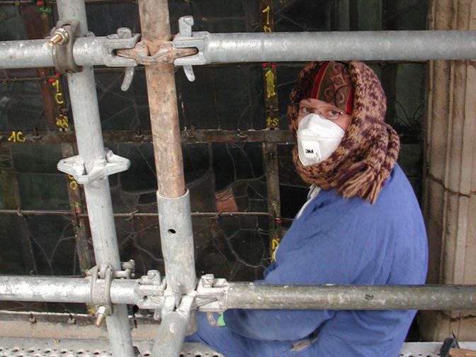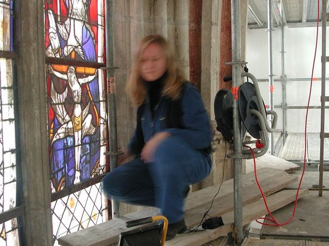 Travail à part entière, la réalisation d’études sur des grands ensembles de vitraux demande une concentration importante, une patience angélique et une résistance physique… Immobilisé devant les panneaux, suspendu dans une nacelle ou perché en haut d’un échafaudage, le restaurateur consigne inlassablement les données. Je remercie toutes les équipes, collaborateurs et stagiaires , qui endurent ou ont enduré les grands froids, les positions inconfortables en altitude et la cohabitation avec les pigeons… en particulier, avec grande amitié, celles qui constituent « le noyau dur » : Marie-Françoise Dromigny, Sylvie Poirson, Ludivine Rougeolle, Fabienne Buffet et Delphine Geronazzo dont le mémoire de fin d’études « De la jumelle à la table lumineuse, les conditions d’observation des études préalables à la restauration des vitraux » constitue une référence incontournable sur le sujet.